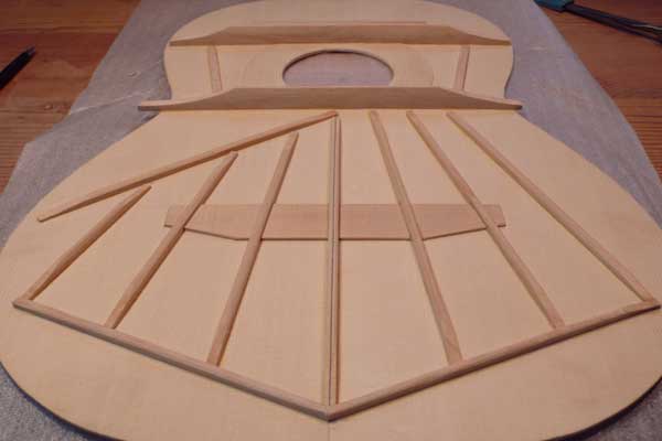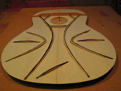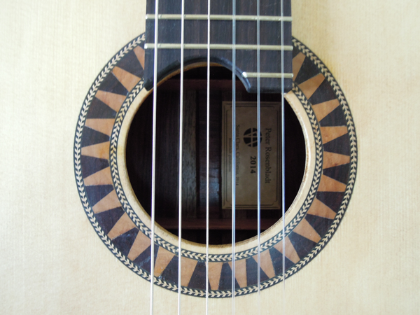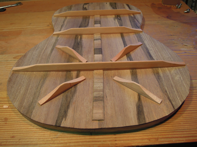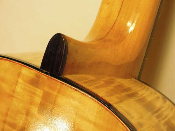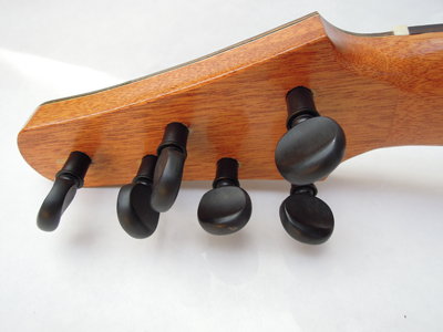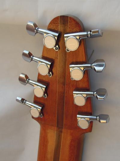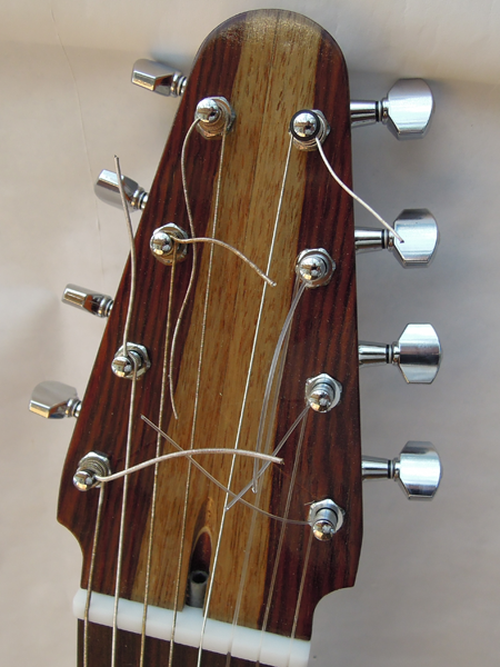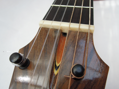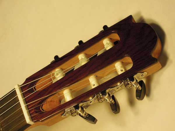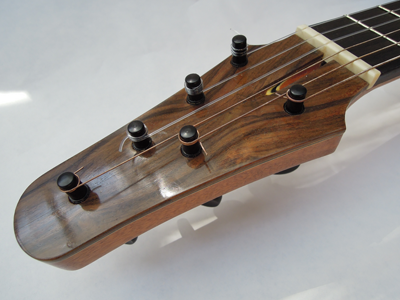 This guitar has a Carpatian Spruce top and Ziricote (Guatemala) sides and back. It has Trevor Gore type unusual bracing on top and back and uses violine-style pegheads and has an adjustable truss rod.