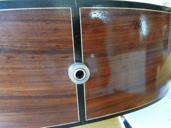 This guitar has Alpine Spruce top, Macacauba Rosewood back and sides, a flat fingerboard and lattice bracing. It also has an electronic pickup saddle and a sound plug and does not require a battery.